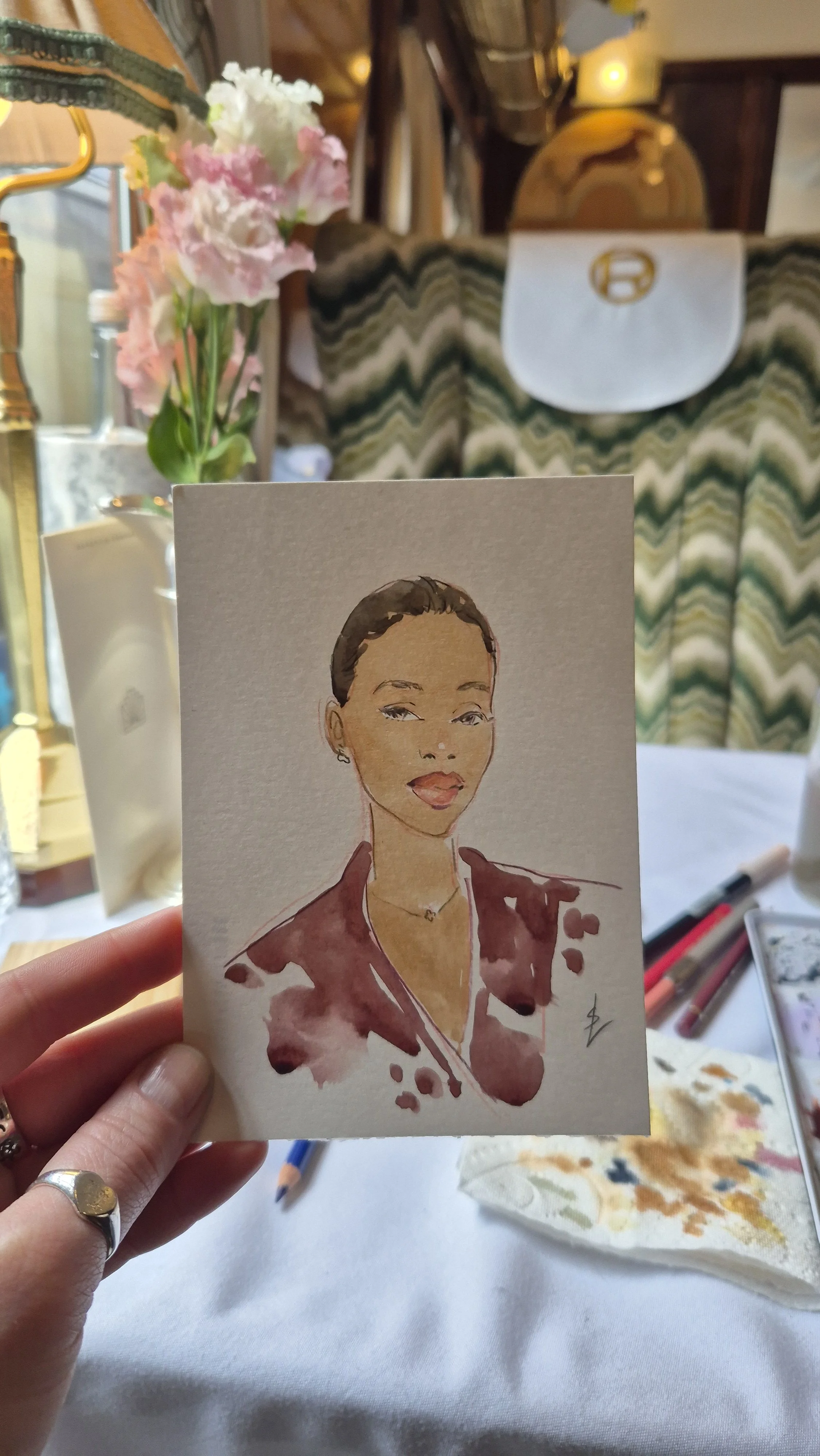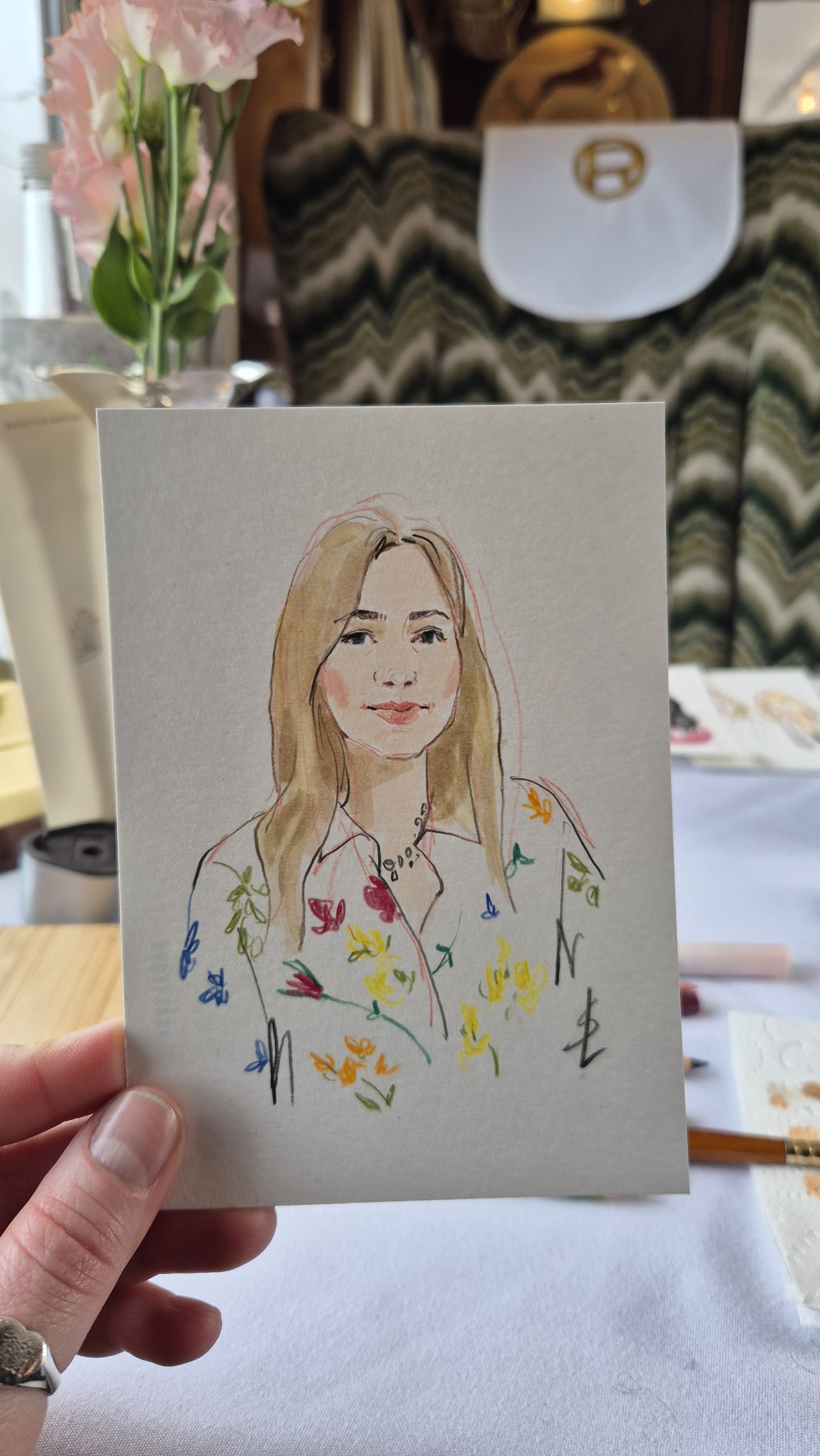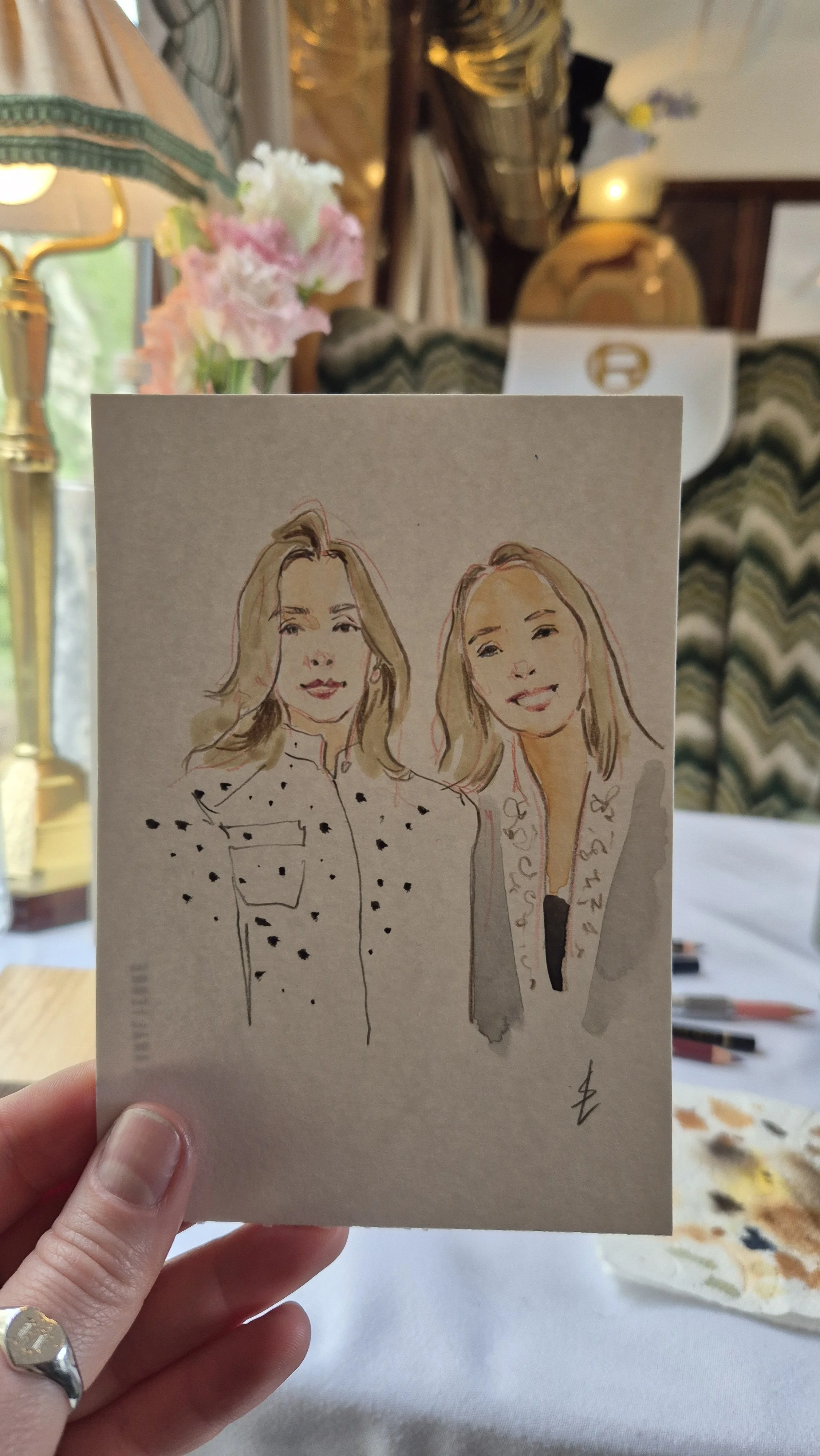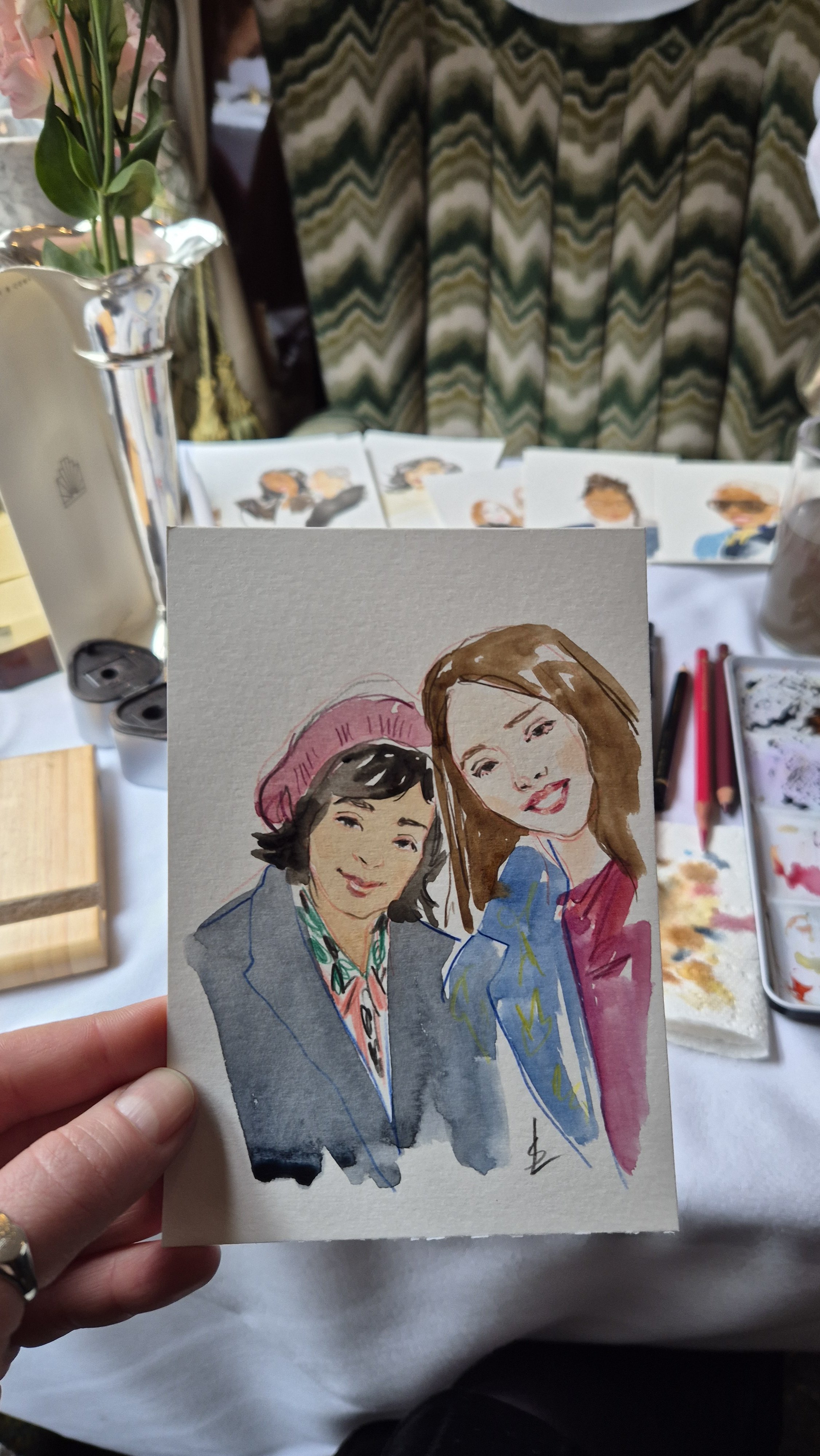 I create stylised and flattering hand painted portraits while capturing the likeness and character of each person in just 10 minutes! It is a lovely gift and a great talking point.