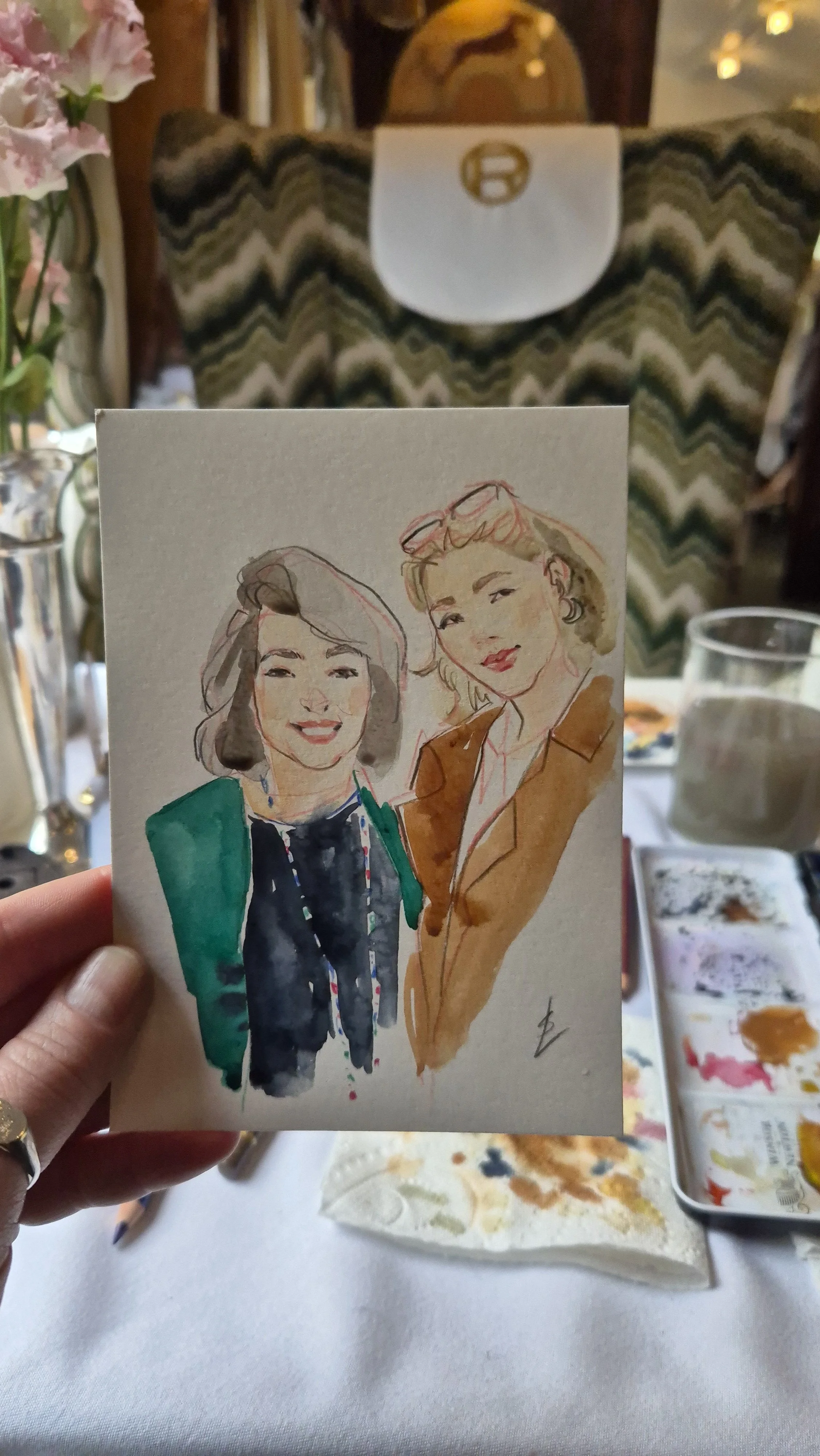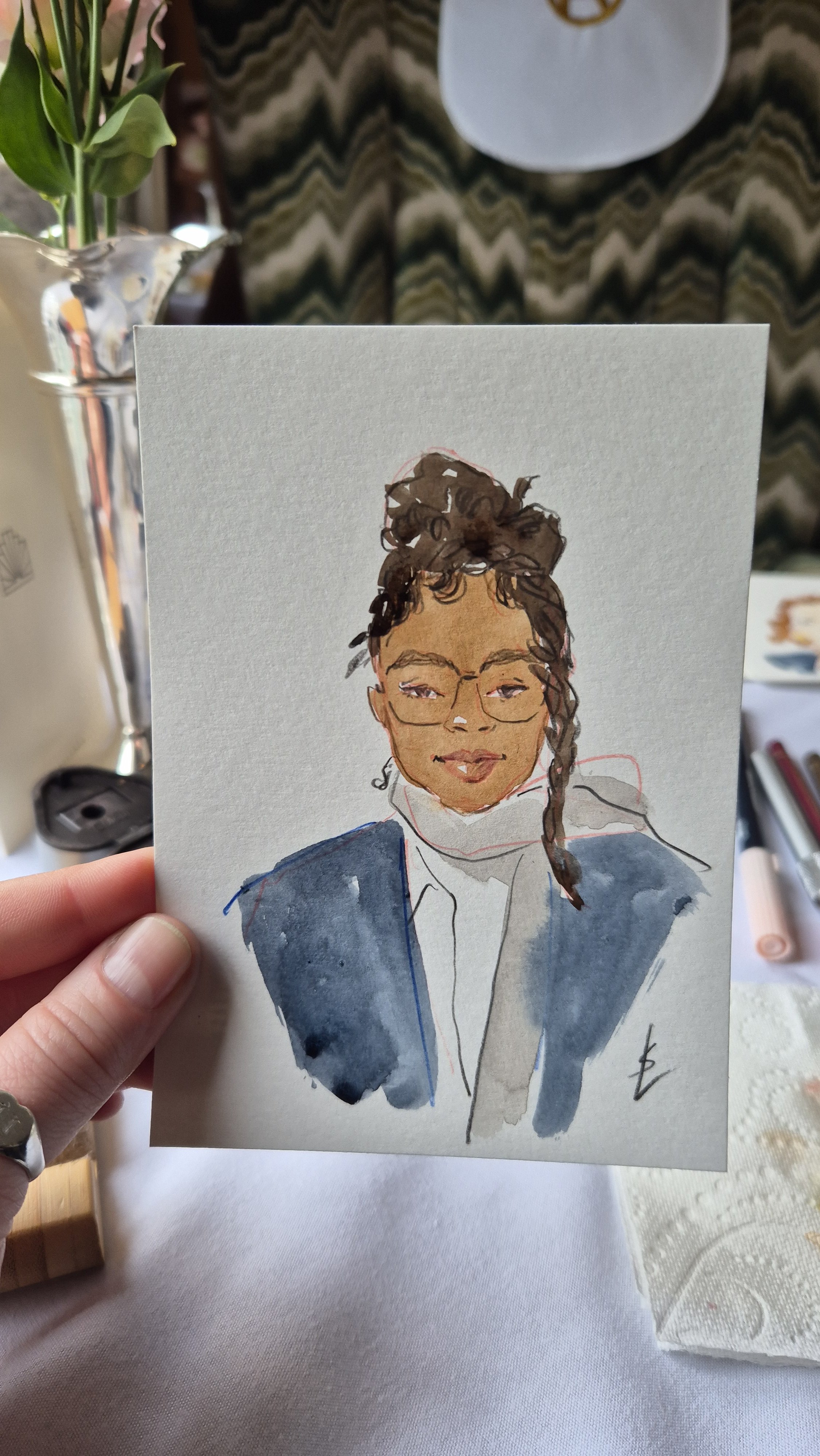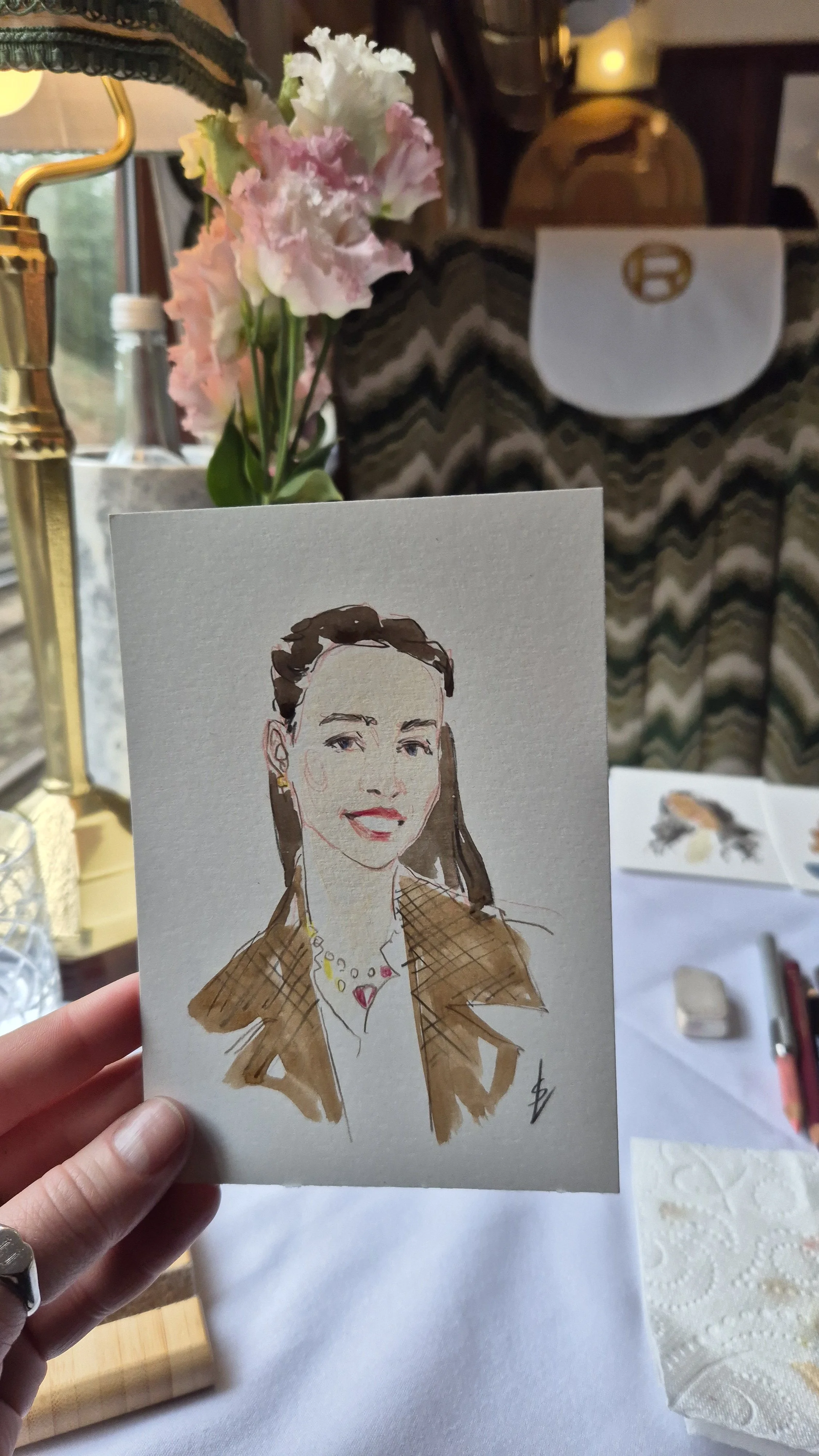 I create stylised and flattering hand painted portraits while capturing the likeness and character of each person in just 10 minutes! It is a lovely gift and a great talking point.