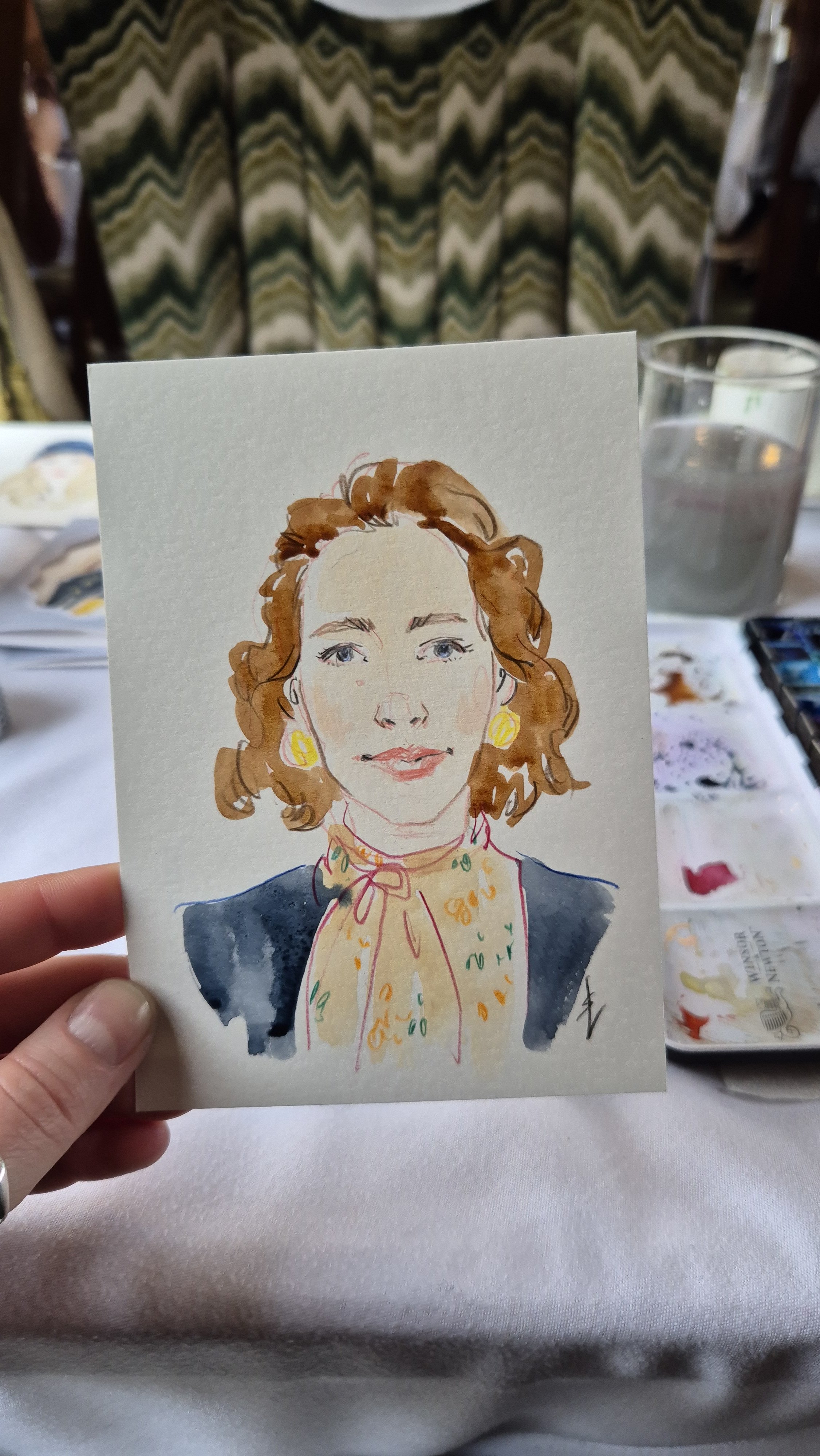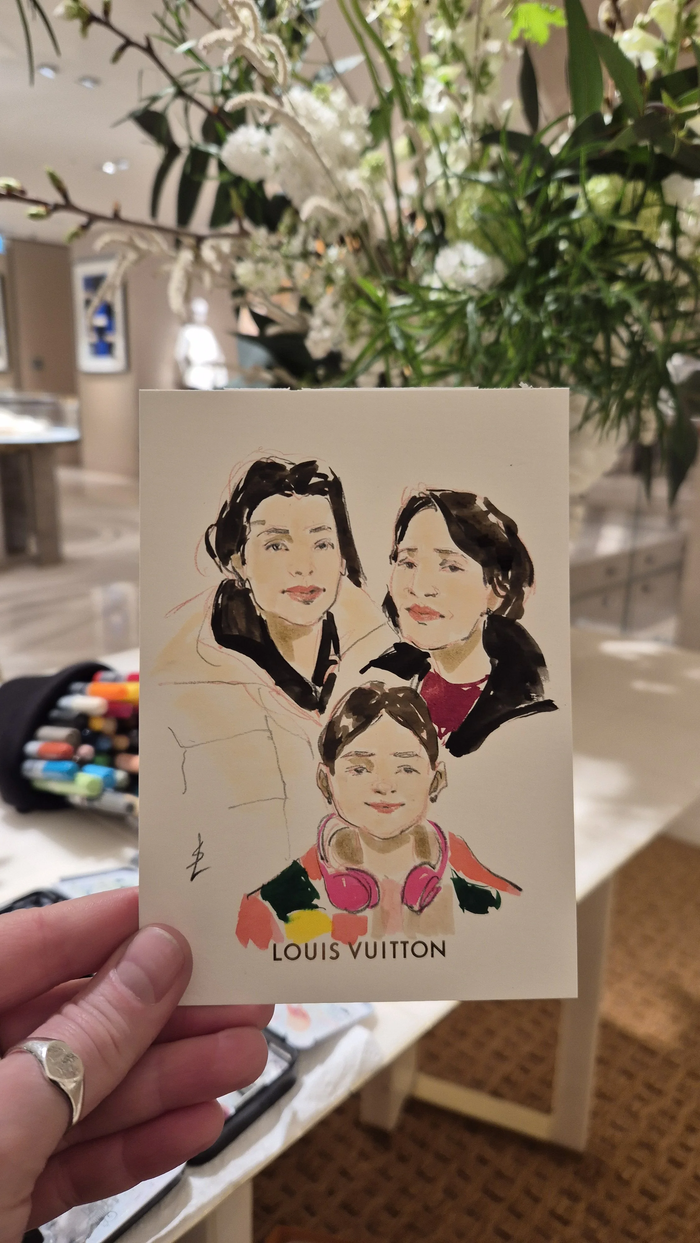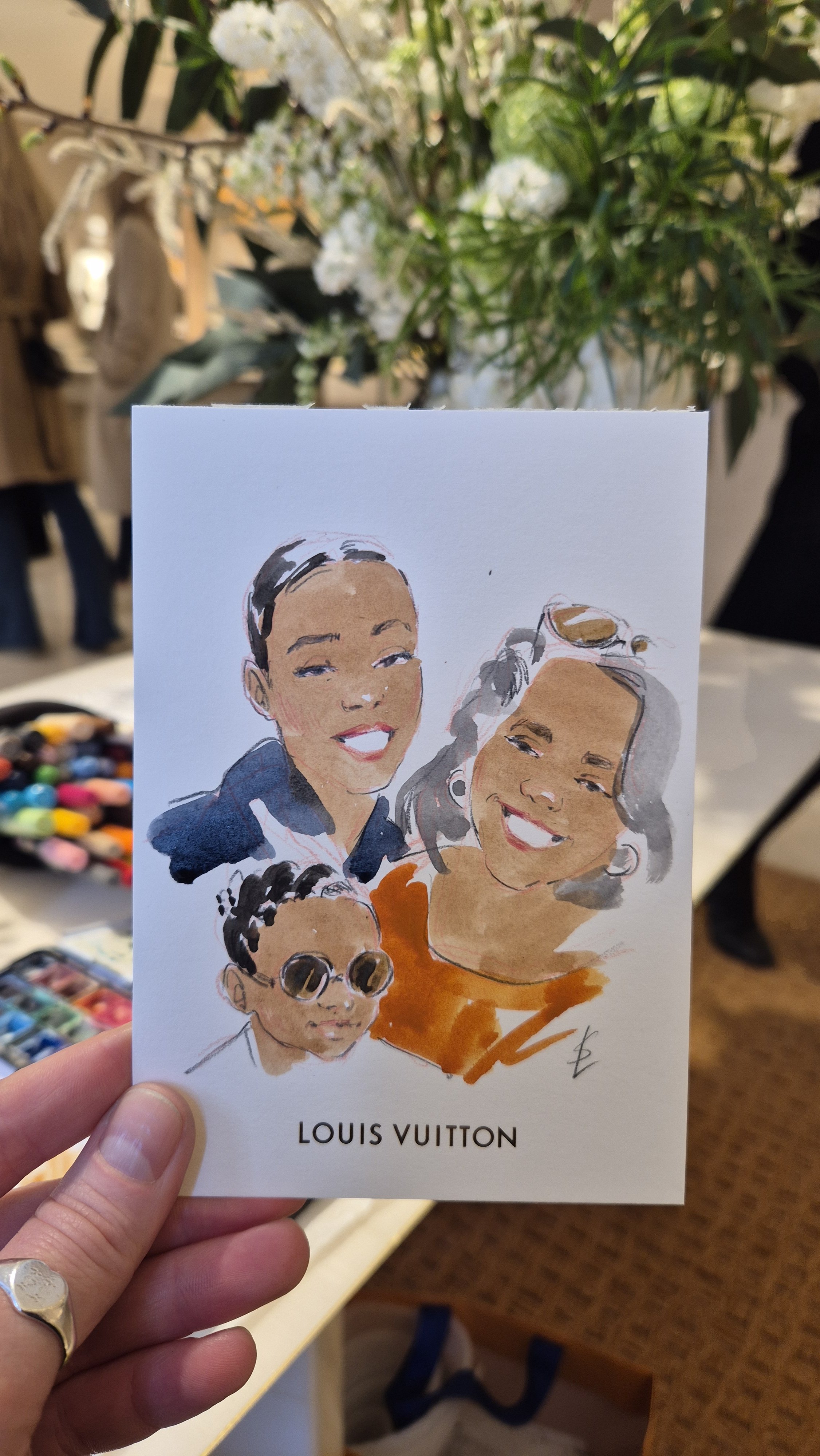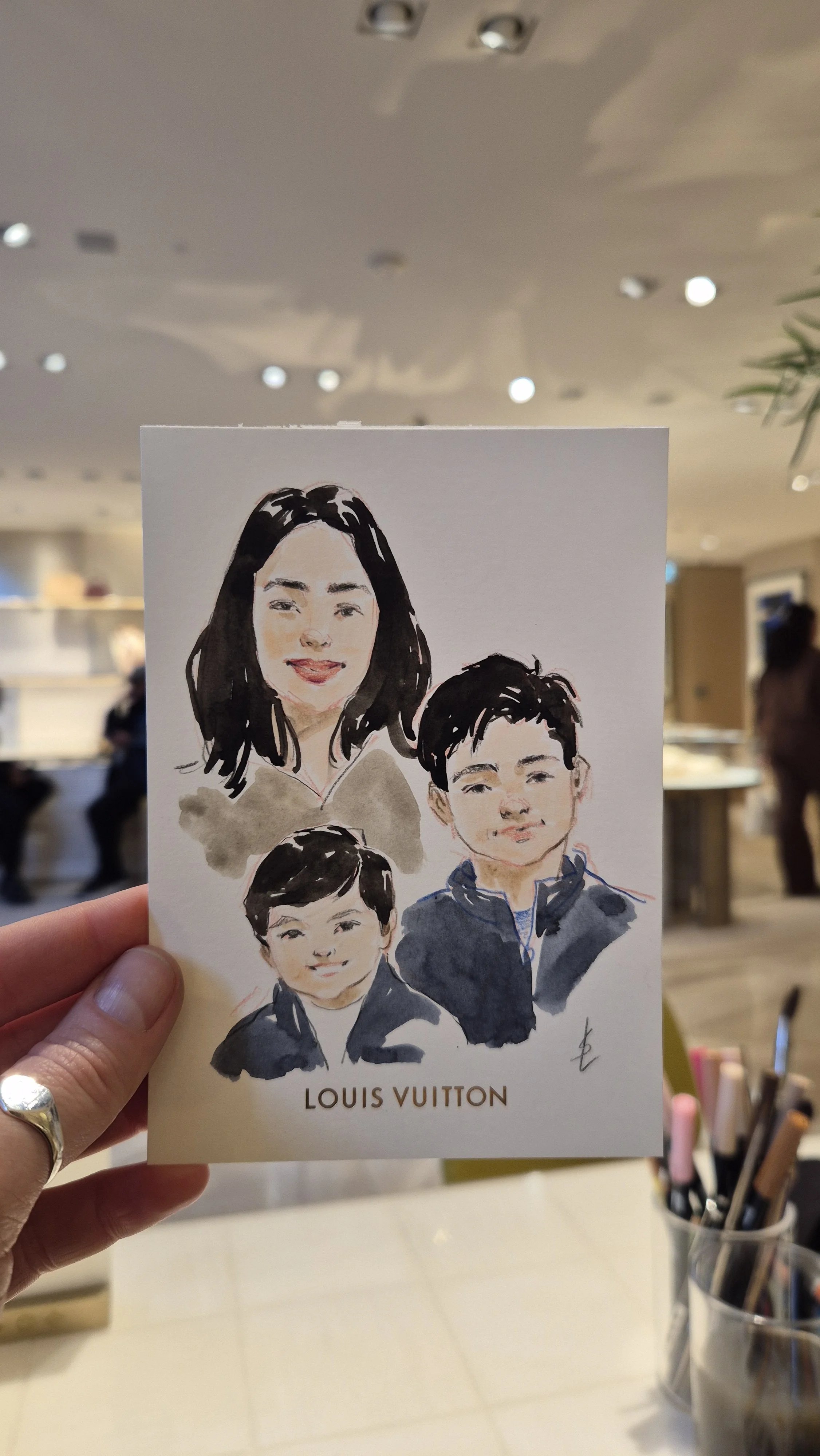 I create stylised and flattering hand painted portraits while capturing the likeness and character of each person in just 10 minutes! It is a lovely gift and a great talking point.
